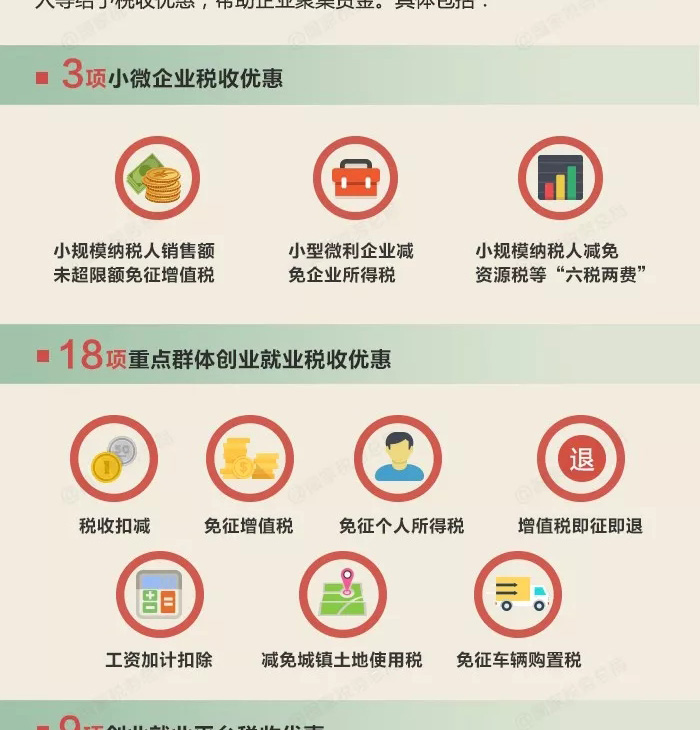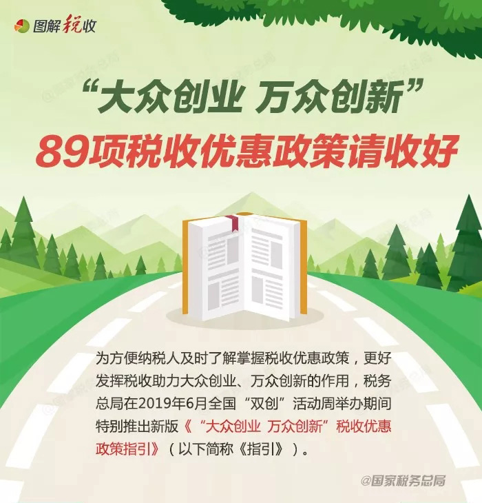 为方便纳税人及时了解掌握税收优惠政策,更好发挥税收助力大众创业、万众创新的作用,税务总局昨天公布新版《“大众创业 万众创新”税收优惠政策指引》,归集了截至2019年6月我国针对创新创业主要环节和关键领域陆续推出的89项税收优惠政策措施,覆盖企业从初创到发展的整个生命周期。小编用一张图为你梳理优惠政策要点,创业的亲们请收好↓